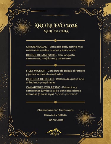 Esta New Year, Aqua Antigua te invita a la celebración más grandiosa de Antigua Guatemala. Disfrute de una deliciosa cena de tres platos en nuestro restaurante, opte por un comedor privado o reserve una cabaña junto a la piscina para disfrutar de música en vivo y espectáculos de fuego con sus seres queridos.